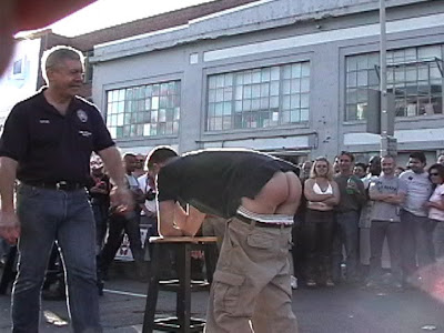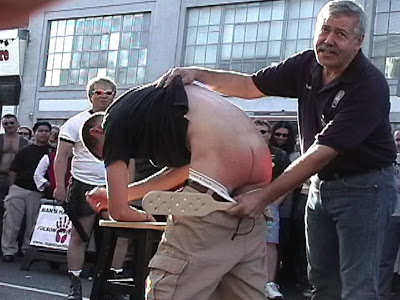 The next swat got a gasp from the crowd – and the young man quickly understood just how much a birch paddle could sting. It left a bright bruise on each of his cheeks – and while he stoically took the final few swats, there is no doubt in my mind that he woke up the next morning thinking “What did I do at the Folsom Fair???”