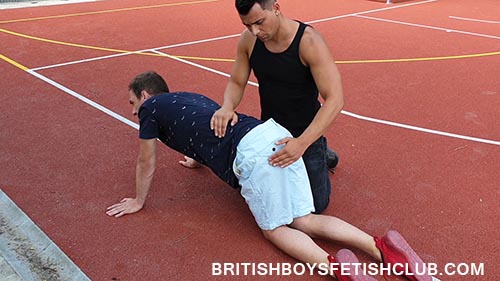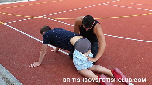 Once the lads shorts are down, after the warm up set, Ryan grabs his underwear and pulls them tight. Seb has a super butt and in a wedgie he looks perfect for a spanking. The red glow that is showing around the underwear is super.