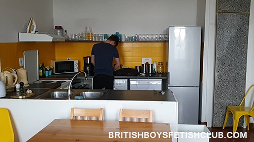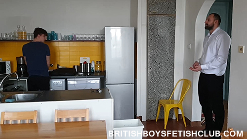 O, ye gods of Spankers’ Heaven! WHAT a Christmas present!!! To tune in all on a Christmas morn and watch young Dominic getting his pert, cheeky bottom smacked! And VERY pert and cheeky he is looking bent over the table in those close-fitting black trousers in a classic position for a naughty boy’s punishment! He seems to have taken on board the understanding that he looks far more spankable with his trousers properly pulled up rather than sagging halfway down his backside! There’s also something so small, young and vulnerable about him standing next to Dimitri’s hulky bulk, which is in itself a turn-on!