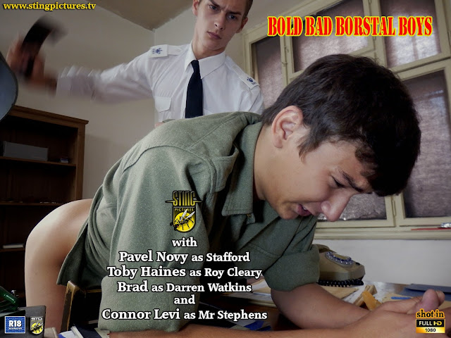 In another office a new entry in the book is about to be made concerning trainee Stafford (Pavel Novey) His record for the month is totally abysmal. Unluckily perhaps for him his House Master officer is a younger man Mr Stephens (Connor Levi) He makes his views about the lads conduct only too clear and starts his punishment by putting this young miscreant straight over his knee.