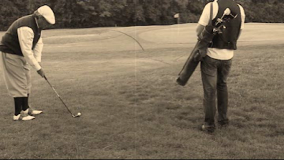 To the sound of Ragtime, a fashionable swell and his caddy make their way on to the golf course. The Great Gatsby lookalike shoots a few birdies down the fairway and then practices his swings while his subordinate catches the balls in a bucket.