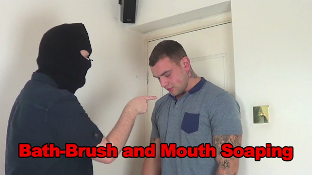 Andy was wrong! Mr X leaves the room and returns with a bar of dripping soap and the dreaded bath brush! Andy is forced to take the bar in his mouth and hold it there whilst back over Mr X’s knee and getting beaten with the wooden bath brush!