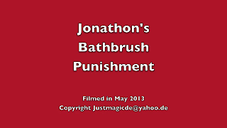 More from JustMagic: “Although I didn’t hit him that hard Jonathon really hated this punishment. He told me afterwards that I was mean not to have warned him about the devastating effect of the brush (he called it “the brush of death”) and that he would prefer a hard caning any day! ….. I think next week he will regret those words!