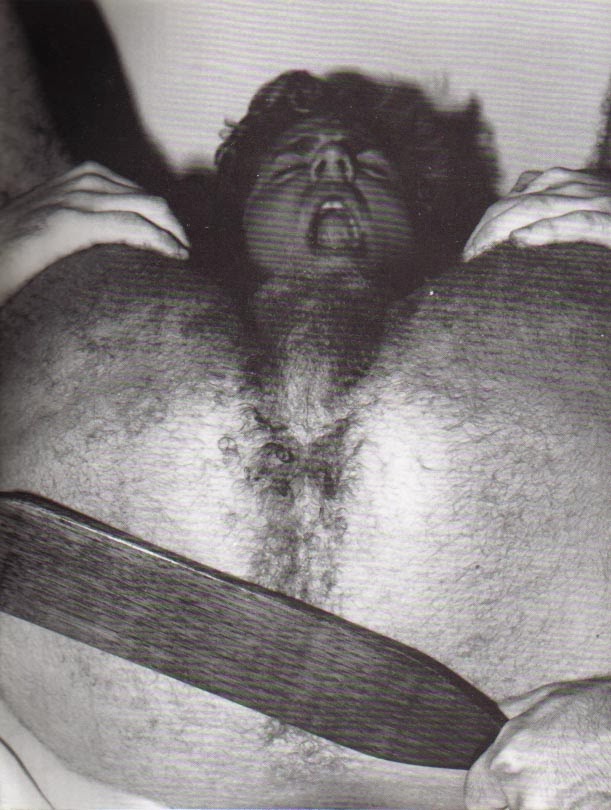 With Robertson now over the vaulting horse, his grey shorts tightly stretched and almost painted on to his buttocks the punishment begins.