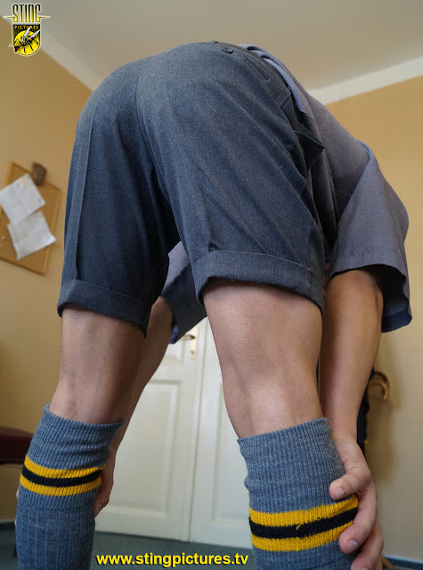 Mr Sharpe had been keeping a watchful eye on Ramsay and knew it was only a matter of time before he’d be knocking on his door too. This senior boy is ordered to bend over and take a caning over his tight grey shorts.