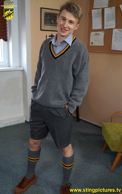 The first to get caught out is Noah Miller (Adam Black) He’d seen fit to raid the college tuck shop and was now having to answer for his crimes to his Housemaster. Sent back to the aforementioned Masters office, young Miller was certainly in for a stinging caning over his tight grey shorts but with out doubt the belt on the bare bottom will surely follow.