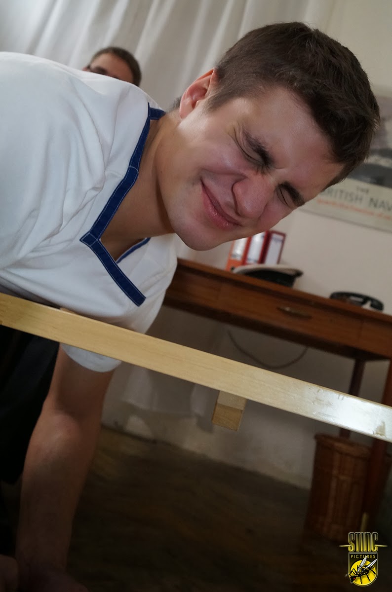 Now changed in to gym kit the young trainee seaman embarrassingly finds himself over the knee of his Captain, for a firm spanking.
