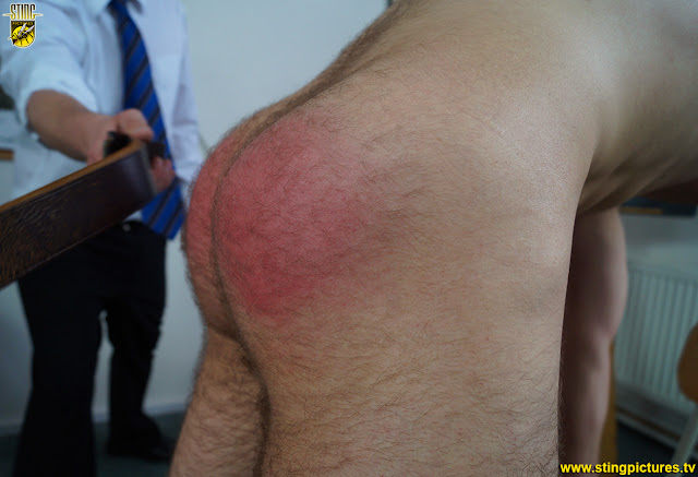 McKenzie’s muscular fuzzy bare backside is throbbing now but such well shaped buttocks like this really deserve a taste of the Housemaster’s strap. Its stinging bands of fire will soon teach this petulant youth who’s is really in charge and it isn’t him!